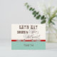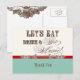 Fontes elegantes e divertidas anunciam a mensagem, "Vamos coma, beba e se case!" em um maravilhoso cartão postal Obrigado Nota. Em uma paleta colorida quente e retrógrada de vermelho-safra, azul-aqua, creme e castanho-chocolate - é o melhor de vintage com uma torção moderna. Seus nomes estão no fundo da área de amplo escrevendo para personalizar o design.