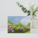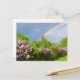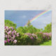 lilases de lavanda florescentes entre árvores verdes e luxuosas com um arco-íris mágico