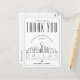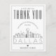 Uma forma excelente de mostrar apreço ao convidado que viajou tão longe do seu caminho para vê-lo, nesta bela cidade. Este obrigado especial que você faz é adaptado ao convidado que esteve no seu casamento na bela cidade de Dallas, Texas. Ele apresenta uma linha do horizonte estilizada da cidade na frente do cartão. Ao contrário, é um ponto para sua própria mensagem exclusiva. Use as funções de personalização para adicionar uma foto, se desejar.