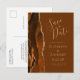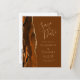 Este elegante cartão postal moderno de save the date apresenta uma borda de ágata com efeito de aquarela laranja queimada e enferrujada, decorada com brilho dourado falso. Personalize facilmente o texto dourado sobre um fundo marrom noz-moscada. No verso, edite o endereço de devolução personalizável e insira a URL do seu site de casamento para gerar um código QR que os convidados podem escanear para saber mais sobre o seu próximo evento.