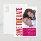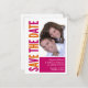 Anuncie seu futuro casamento com nossos Cartões de Anúncio Salvar a Data com um texto e um espaço de imagem cor-de-laranja e rosa em negrito. Basta adicionar suas informações e fotos do casamento e você está pronto para ir! Carimbos de correio e selos de envelopes disponíveis em nosso compro