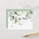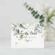 Este elegante cartão de save the date horizontal com folhagem em dourado é perfeito para um casamento moderno. O design apresenta folhas de eucalipto verdes botânicas e douradas desenhadas à mão, inspirando beleza artística.