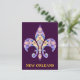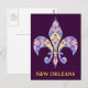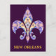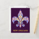 Características que deste design do cartão uma flor de lis do caleidoscópio em um fundo roxo com as palavras Nova Orleães no ouro rotula.