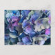 Cartão postal de flores de hortênsia azul para usar em qualquer ocasião. O texto de exemplo na frente é "Pensando em você" com sentimento continuado no verso que diz "e enviando uma oração". O restante do cartão está em branco para uma nota manuscrita. A fotografia de uma hortênsia azul brotando é a imagem na frente com texto no canto superior. O verso também tem uma imagem de fundo desta flor. Use para "melhoras", "feliz aniversário" ou uma simples mensagem para dizer olá a um amigo.