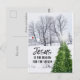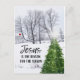 Esta cena de neve de árvores nuas com uma lâmpada vermelha solteiro pendurada num galho. Uma árvore de Natal verde no primeiro plano com uma estrela brilhante no topo. O ditado "Jesus é a razão da estação" diz tudo.