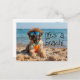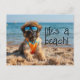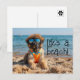 Um filhote de Leonberger vestindo óculos de sol na praia. Um cartão postal divertido. A mensagem "A vida é uma praia!" pode ser removida ou substituída pela sua própria mensagem.