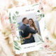 Lindo cartão de agradecimento de casamento com uma foto floral cor-de-rosa beije com moldura de folhas em aquarela.