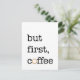 Cartão inspirado que indica a frase "mas o primeiro café" no tipo preto em um fundo branco com uma mancha marrom do café.