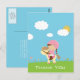 Este obrigado de meninas que você posta tem uma menina cabeleira marrom giro em um cavalo de desenho em um campo de flores. Há nuvens brancas puffy no céu com o sol a espreitar por trás de uma nuvem. Isso pode ser facilmente personalizado com a mensagem do seu obrigado no verso. Esta é parte de um conjunto de Convites de aniversário correspondente. Gráficos por Designs do Zenware em Mygrafico