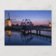 Cartão-postal de duas moinhos de vento iluminadas e uma ponte de tração com reflexo na água do canal na última luz do pôr do sol em Kinderdijk, nos Países Baixos.
