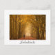 Cartão postal de uma mulher que caminha com o seu cão através do nevoeiro matinal num caminho numa floresta de faia em cores do outono com uma fronteira branca e o texto: "Países Baixos".