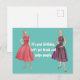 O divertido design do tema apresenta duas mulheres da década de 1950 em fundo azul com branco "É seu aniversário. O vamos obtém o bebado e ajusta o texto personalizável do pessoas.