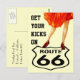 Cartão retro do estilo que honra viagens por estrada & naturalmente… rota histórica 66. Vestido & calçados vermelhos na "rota 66" sinal. Isto faria um grande cartão de sua viagem por estrada & igualmente seria um grande cartão da propaganda. você pode colocar sua informação do negócio na área de texto na parte traseira!! Aprecie a vida & os obrigados para parar perto!