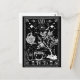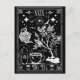 Design de cartão de tarô de Grunge para amantes de chá! O Chá. Ilustração branca e preta com um bule de chá mergulhando água numa xícara de chá, arbusto de chá e esqueleto.
