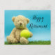 O urso tênis Teddy está segurando um cartão de aposentadoria