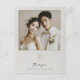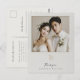 Elegante obrigado de casamento que você postcard com uma foto personalizável formada por um simulado design de marfim esculpido em tons suaves e esbranquiçados. Um delicado emblema de galho com um efeito inspirado em letterpress acompanha a mensagem sentida de "Obrigado", juntamente com os nomes do casal para um toque pessoal. Esse cartão-postal mínimo, porém refinado, é perfeito para expressar gratidão aos convidados de casamento em estilo eterno e sofisticado.