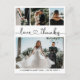 Elegante Cartões de agradecimentos de Casamento de Colagem de Fotos com Script 4 de Coração de Orçamento Elegante em preto e branco. Design de placa de casamento minimalista, na moda, com quatro (4) colagens de fotos na grade na frente e uma (1) foto no verso. Texto de "obrigados e amor" num cursivo texto escrito à mão com letra tipográfica (caligrafia) fofa cardíaca com cauda de inchaço. Personalize com seu nome e obrigado sua mensagem. Se precisar de ajuda ou item correspondente, entre em contato com o designer!