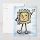 Ricky Ravioli é um personagem ravioli de estilo vintage em amarelo e rosa com um fundo pontilhado azul.