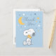 Envie uma nota de agradecimento verdadeiramente pessoal com este lindo cartão-postal de agradecimento do Peanuts Snoopy e Woodstock. A frente apresenta a ilustração emocionante "Over the Moon" com Snoopy abraçando Woodstock, contra um fundo celeste azul claro calmante. Ao contrário de um cartão padrão, o verso é projetado em um estilo clássico de cartão-postal, apresentando uma área designada para uma mensagem manuscrita e endereço, tornando fácil para os pais escreverem rapidamente uma nota pessoal e sincera para cada convidado após o chá de bebê neutro ou de bebê menino. Esta é uma maneira simples, bonita e eficiente de enviar gratidão.