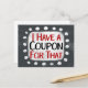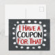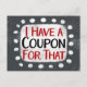 "Eu tenho um cupom para isso" é um design de texto fofo em cinzas com texto preto e vermelho, junto com uma forma de sotaque branco e pontos brancos texturizados ao seu redor.