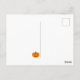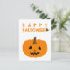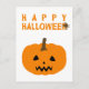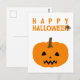 Um cartão postal do Dia das Bruxas com uma abóbora e um texto "Feliz Dia das Bruxas" em branco. Personalize o fundo branco entre outras opções.