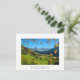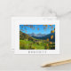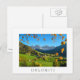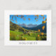 Cartão postal da aldeia de Ruas. Magdalena ou Papais noeis Maddalena com a igreja característica em frente dos picos da montanha Geisler ou Odle Dolomites no Vale do Val di Funes (Villnoesstal), em Itália, no outono, rodeada por folhas de outono com uma fronteira branca e o texto: "Dolomites", italiano para "Dolomites".