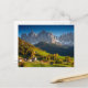 Cartão com o St. Magdalena da vila com sua igreja no Villnoesstal em Tirol sul, Italia, durante a estação do outono com as montanhas das dolomites de Geisler no fundo.