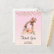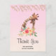 Obrigado postal com um desenho fofo em aquarelas de uma mãe e girafa bebê. A girafa-mãe está descansando a cabeça sobre a girafa do bebê, amorosa e adorável. Bonito buquê rosa, amarelo, verde, de flor de aquarela colocado debaixo deste par de queridos. Um plano de fundo gradiente criado usando uma mistura de cor rosa suave em cor laranja de pêssego claro.