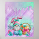 Páscoa Bunny Gnomo com orelhas de coelho cor-de-rosa sentados em flores de primavera com ovos decorados e um cesto de cenouras mais vadio colocado sobre uma cor d'água e fundo de xadrez roxo com gotas de gelo pastel doce.
