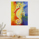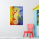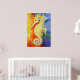 Cavalo-marinho brilhante e branco renderizado em amarelo, vermelho e azul é de uma pintura original a óleo por Jenny Speckels.