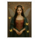 This enchanting artwork features a fairy princess in a teal green and crimson red gown adorned with golden embroidery, set against a grayish-brown background with floral motifs. Her serene gaze and shimmering iridescent wings evoke a sense of regal grace and timeless fantasy. Perfect for lovers of fairy tales, fantasy art, and magical elegance. This artwork was generated by AI based on original human concepts.