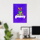 Um poster com um design de tipografia com um sinal de paz no arco-íris com dedos erguidos em um V. Text diz 100% de ranhura em uma fonte estranha. Design de tema hippie psicodélico. Colocado sobre um fundo roxo.