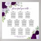 Este assento de casamento impressionante inclui 10 mesas adornadas com um design floral rústico com rosas de aquarelas pintadas delicadamente à mão em tons de roxo real, lavanda e ameixa, com sotaques de folhas de eucalipto pelúcias e verde de jardim. A disposição alberga até 100 convidados, com 10 lugares disponíveis por mesa. O título elegante da caligrafia diz "por favor encontre sua mesa" e os nomes do casal e do casamento aparecem no fundo. Este gráfico de assentos é esteticamente agradável e funcional, fazer fácil para os hóspedes localizar seus assentos designados enquanto adiciona à beleza geral de sua recepção de casamento.