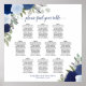 Este impressionante quadro de assentos de casamento inclui 10 mesas adornadas com um charmoso design floral rústico com rosas de aquarelas pintadas delicadamente à mão em tons de azul empoeirado, marinho e índio, com sotaques de folhas de eucalipto e verde-jardim. A disposição alberga até 100 convidados, com 10 lugares disponíveis por mesa. O título elegante da caligrafia diz "por favor encontre sua mesa" e os nomes do casal e do casamento aparecem no fundo. Este gráfico de assentos é esteticamente agradável e funcional, fazer-o sem esforço para os hóspedes localizarem seus assentos designados enquanto adiciona à beleza geral de sua recepção de casamento.