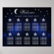 Um quadro de 10 mesas para um tema de casamento celestial, com a lua e a estrela num fundo azul-noturno estrelado. Os números das mesas estão escritos em grandes estrelas de cinza. A lua, as estrelas e a palavra Bem-vindo (escrita em um roteiro caligráfico elegante) são cinzas de prata, o resto do texto é branco. A foto noturna estrelada é de Felix Mittermeier, de Pixabay, e está livre para uso comercial.
