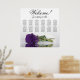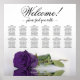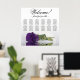 Este gráfico de assentos de casamento tem 12 mesas e ostenta uma design romântica, elegante e bonita. Um arranjo floral moderno é acentuado por um rosa roxo real roxo, solteiro longo e profundo, que se encontra do seu lado, refletindo numa piscina de água. O título, "Bem-vindo! por favor encontre sua mesa", está escrito em caligrafia de rico, enquanto os nomes do casal e a data do casamento são exibidos na parte inferior. Com atribuições de mesa para 120 convidados e 10 assentos por mesa, este gráfico fornece amplas disposições de assentos para seus convidados desfrutarem da celebração.