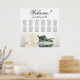 Este gráfico de assentos de casamento tem 12 mesas e ostenta uma design romântica, elegante e bonita. Um arranjo floral moderno é acentuado por um rosa solteiro, de cor branca ou creme, , , de fundo longo, que se reflete numa piscina de água. O título, "Bem-vindo! por favor encontre sua mesa", está escrito em caligrafia de rico, enquanto os nomes do casal e a data do casamento são exibidos na parte inferior. Com atribuições de mesa para 120 convidados e 10 assentos por mesa, este gráfico fornece amplas disposições de assentos para seus convidados desfrutarem da celebração.