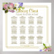 Este quadro de casamento vai tornar a sua recepção bonita. Apresenta texto dourado sobre fundo branco com uma borda de quadrados offset dourada e um belo buquê pastel de flores, incluindo rosas cor-de-rosa, lírios e orquídeas brancos, e hidrangea púrpura ou lavanda leve. O texto inclui o nome do casal e a data do casamento e é perfeitamente personalizável. Este gráfico mostra atribuições de assentos para 12 mesas, de modo que seus convidados terão facilidade em encontrar a mesa certa.