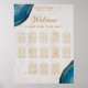 O mapa de assentos de casamento tem 13 mesas. Nos cantos, superior esquerdo e inferior direito, há geodos de ágata azul. O fundo é de mármore branco. Os nomes da noiva e do noivo são escritos em uma fonte caligráfica elegante. Todo o texto tem uma cor dourada. O geodo azul é de uma foto de Robert Ramsay da Pixabay e é gratuito para uso comercial.