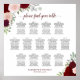 Este lindo gráfico de 13 mesas de assentos de casamento apresenta um design bócio rústico com rosas de aquarelas pintadas manualmente em tons de burgundy, vermelho e rosa-pincel, cercado por folhas de eucalipto e verde de jardim. O arranjo tradicional tem espaço para 130 nomes com 10 assentos por mesa. O título é escrito em uma caligrafia elegante, e há espaço para os nomes do casal e da data de casamento abaixo. Uma maneira maravilhosa de adicionar beleza e estilo à sua recepção enquanto fazer que seja fácil para os seus convidados encontrar os seus lugares.