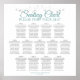 Torne sua recepção de casamento bonita com este assento. Ele apresenta um design simples, mas elegante, com um título de letra de rico ou script turquesa e texto de cinza em um fundo branco com uma borda floral de folha de papel prateada. Este gráfico mostra atribuições de mesa para 130 pessoas com 10 lugares por mesa para que seus convidados tenham facilidade em encontrar a mesa certa.