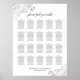 Este quadro de assentos de casamento apresenta missões de mesa para 200 convidados, com 10 pessoas em cada mesa. O design é simples, mas elegante, com texto de cinza escura sobre fundo branco. Há caramujos e espirros de folha de alumínio prateada nos cantos e caligrafia elegante lendo "por favor encontre sua mesa." Belo acréscimo à sua recepção de casamento.