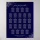 Este lindo gráfico de assentos de casamento de 23 mesas apresenta um simples, mas elegante design com texto de cinza pálida sobre fundo azul marinho e filigre floral de prata de folha fina de folha fina nos cantos. O título da caligrafia do script diz: Por favor, encontre sua mesa. Contém atribuições de mesa para 230 convidados em 10 convidados por mesa.