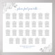 Este lindo quadro de assentos de casamento tem 27 mesas em 10 lugares por mesa ou 270 convidados. Ele apresenta um design simples, mas elegante, com cinzas escuras e texto azul claro sobre fundo branco e filme decorativo de folha de prata nos cantos. O título é escrito na caligrafia do rico e diz: Por favor, encontre sua mesa. Na moda e sofisticado!