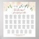 Esta tabela de 27 mesas de assentos é rústica, elegante e bonita. Apresenta um design floral de cor d'água pintado manualmente com rosas e flores em tons pastéis neutros de champanhe ou pêssego pálido. As flores são intercaladas com manchas de folhas de eucalipto e folhagem com um título de caligrafia de escrita antiga, que lê "Bem-vindo! por favor encontre sua mesa". Com espaço para 270 convidados em 27 mesas com 10 assentos por mesa e os nomes dos casais e a data de casamento mostrados no fundo, este quadro de assentos é uma maneira maravilhosa de dar boas-vindas aos seus convidados à sua recepção enquanto fazer fácil para eles encontrar seus assentos.