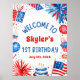 Celebre o primeiro aniversário do seu filho com o nosso Sinal de Boas-vindas Patriótico de 4 de julho! Esse sinal vibrante apresenta um design vermelho, branco e azul com estrelas, listras e fogos de artifício, perfeito para marcar o tom festivo. Personalizado com o nome do seu filho, cumprimenta calorosamente seus convidados para se juntarem à diversão. Os detalhes da parte, incluindo data, hora e local, são claramente exibidos para sua conveniência. Impresso em material de alta qualidade, ele garante durabilidade durante toda a celebração. Faça seu primeiro aniversário inesquecível com este sinal de boas-vindas!
