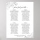Este lindo gráfico de assentos de casamento de 4 mesas inclui atribuições de mesa para 40 convidados, com 10 pessoas em cada mesa. O design é simples, mas elegante, com texto de cinza sobre fundo branco e apresenta um arquivo floral herdado nos cantos e um título de caligrafia com script de rico que lê "por favor encontre sua mesa". Sofisticado e chique.
