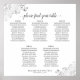 Esta carta de 5 mesas de casamento ajudará seus convidados a encontrar a mesa certa na sua recepção. O design é simples e elegante, com texto de cinza escura sobre fundo branco e filigre floral de folha de folhas prateada herdada nos cantos. O título diz "por favor encontre sua mesa" em uma caligrafia elegante. Sofisticado e chique. Inclui atribuições de mesa para 50 convidados com 10 lugares por mesa.