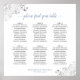 Este gráfico de 6 mesas é simples e elegante, com cinzas escuras e texto azul claro sobre fundo branco e filme floral de folha azul-prateado nos cantos. O título diz "por favor encontre sua mesa" em uma caligrafia elegante. Sofisticado e chique. Inclui atribuições de mesa para 60 convidados com 10 lugares por mesa.
