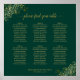 Este gráfico de 6 mesas é simples e elegante com texto dourado sobre fundo verde esmeraldo e filigre floral herdado nos cantos. O título diz "por favor encontre sua mesa" em uma caligrafia elegante. Sofisticado e chique. Inclui atribuições de mesa para 60 convidados com 10 lugares por mesa.